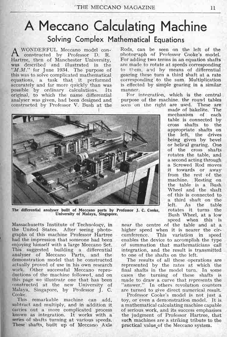 Anon. "With the Editor. Meccano Aids Scientific Research" Meccano Magazine, XIX, 6, 441, 1934. A one page introduction to a following article Anon. (1934B) discussing the Manchester Meccano differential analyzer and Bush's prototype at MIT.